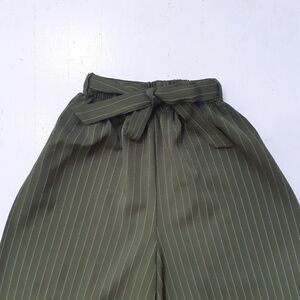 Elastic waistband with belt tie detail, 3/4 length wide leg palazzo pants in olive green with a pinstripe pattern. Unlined. Size XS. Belt is removable / replaceable if you want. No stains or tears excellent preloved condition.