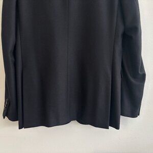The jacket has a notch lapel, features flap pockets and is double vented. The fabric is a classic black in 100% wool with subtle texturing similar to hopsack.
