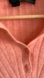 Elegant coral sweater with ribbed texture. Features a classic V-neck and button details. Perfect for layering.