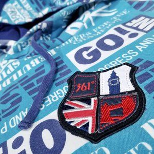 • Features: Kangaroo pocket, Hood, Drawstrings, Long sleeves, All-over diagonal print, Patch on chest