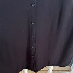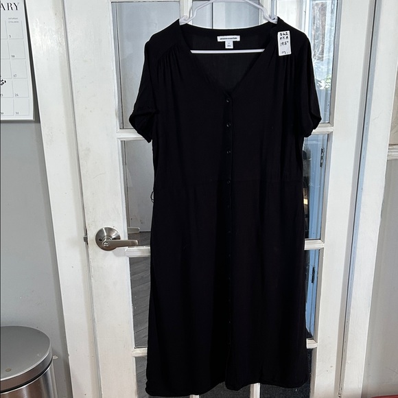 Chic black midi dress with button-down front to the hem. Short sleeves and v-neckline. Has belt loops-no belt. Versatile and stylish. PTP 19”. 100% Viscose