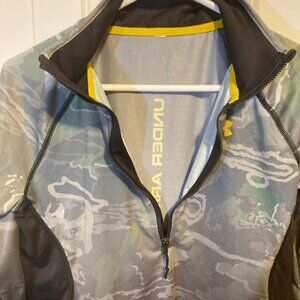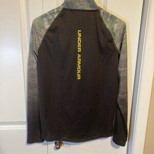Under Armour Camouflage Half-Zip Pullover, Size Medium. Features a yellow Under Armour symbol on the left side and the words "Under Armour" printed vertically on the back. Lightweight and comfortable, perfect for layering during outdoor activities or casual wear.