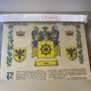 A unique and personal gift or keepsake if you are a Miller. This Authentic House of Names family crest and history has been memorialized and mounted on Plak It.