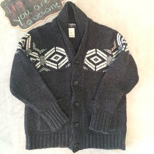 This adorable Oshkosh classic cardigan sweater is in good condition. Classic white geometrical design on a grey background, this piece is quintessential Canadian. Double pockets, and high crew collar this piece can be suited up or dressed down. A classic piece for your little ones closet.