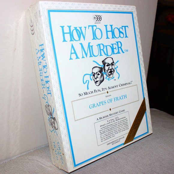 100% official licensed HOW TO HOST A MURDER PARTY Grapes Of Frath murder mystery game. Manufactured by CANADA GAMES / INTUITIVE MARKETING for year 1985 release. Proudly made in Canada. Very scarce vintage collectible, long since sold out.