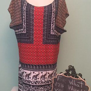 This elephant combo blouse, and necklace are in excellent condition. The Suzy Sheir tunic blouse is magestically crafted with a layered look design. The colour combination is rich and elegant and boasts beautiful elephants and wild paisley. The extra long jewelled elephant costume jewellery adds the touch needed. The multi colour jewels on the necklace bring charm and beauty to this piece.