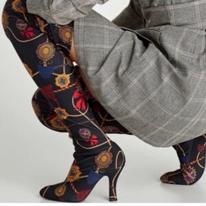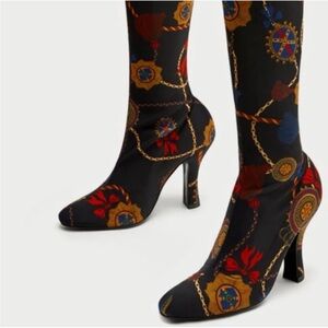 [38/7-7.5]ZARA Woman Black Satin Scarf Print Thigh High Heel Pointed Boots
