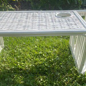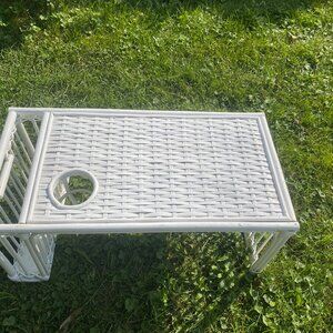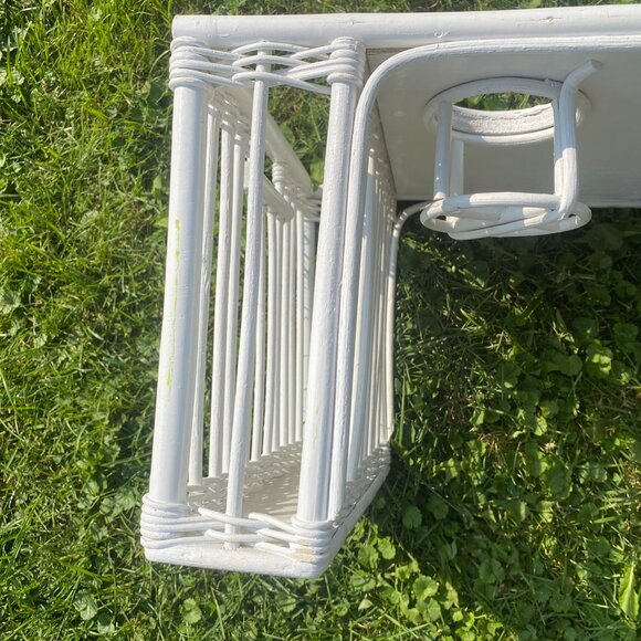 This vintage white rattan wicker breakfast in bed table is in excellent condition. Serve up your lover a delicious morning with this romantic white functional piece. The cup holder adds a safety meaure to lessen the spill of the mimosa morning treat. Tuck in their favourite romance novel or sultry morning read in the side magazine holder. Or, offer up some of the local hot tourist spots when serving up breakfast in your establishment.