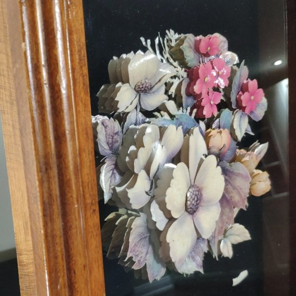 Vintage Paper Tole 3 Dimensional Art, Floral Bouquet, 3 and 4 layers at different areas of the Paper Art, Encased in Shadow Box Frame and protected by Glass, Signed "Nicole" 12 inches in height, 10 inches in width and 2.25 inches deep. Very Good Vintage Condition, no chips, no cracks, some light wear on the frame, stand not included, please see pictures for further details
