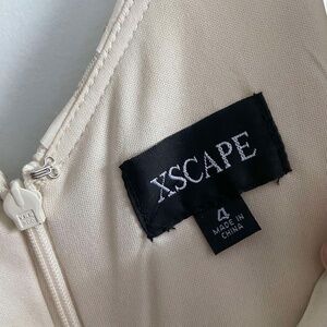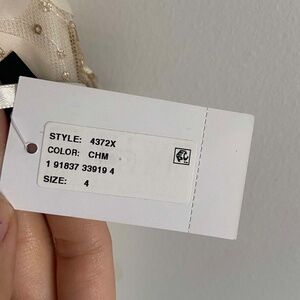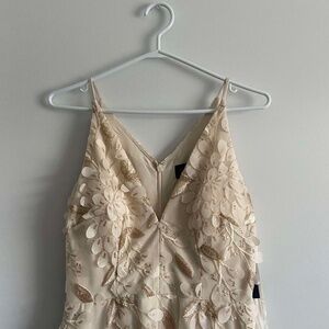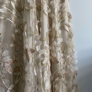 * Midi length champagne gold/ beige/ cream dress with subtle gold glitter and 3D floral appliqué