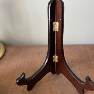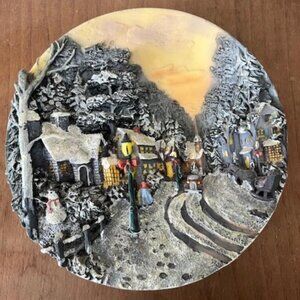 Textured 3D decorative plate with winter scene, includes wooden plate stand, can be placed in stand or used back hook for hanging on the wall, back looks white in pictures but is actually light blue,