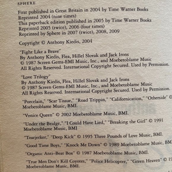 - Red Hot Chili Pepper's frontman/signer Anthony Kiedis autobiography written in collaboration with Larry Sloman.
