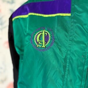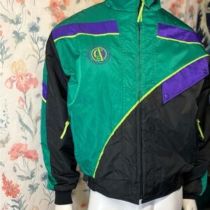 Experience warmth and style on the slopes with this 3M Thinsulate ski jacket, featuring a vibrant green and purple color-blocked design. The jacket's full-length zipper and elasticized cuffs ensure a snug fit, while the standing collar adds a touch of retro flair. Perfect for skiing or snowboarding adventures, this jacket combines functionality with a bold aesthetic.