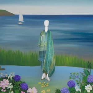 "3 piece, ready-to-wear lawn suit in green color. Beautifully embroidered daaman. Back printed. Border embroidery on silk dupatta.