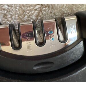 This 3-stage knife sharpener offers ceramic, coarse, and fine sharpening slots. The ergonomic handle ensures a comfortable grip during use. The detachable head allows for easy cleaning and maintenance, enhancing its utility in kitchen settings.