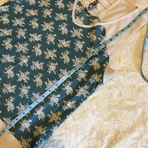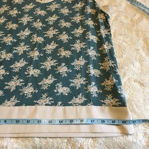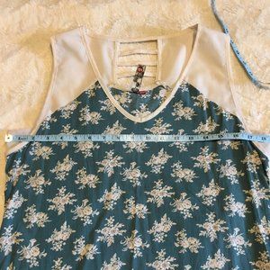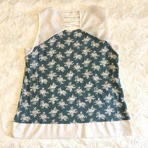 Excellent preowned condition, teal tank top with white floral pattern by Canadian label, 3stones. This is a gorgeous tank with very nice details. The cream trim and band of cream along the bottom hem as well as the shoulders tie it all together nicely. Slated fabric detail in the back.