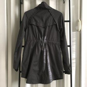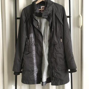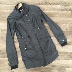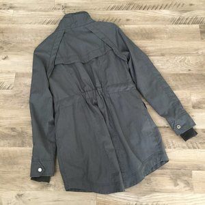 Excellent preowned condition, greyish-blue utility jacket with high collar and plenty of pockets by British Columbia's 3Stones. This is a gorgeous coat by a sustainable and stylish Canadian company. A very underrated brand with high quality goods. Long, comfortable, fitted and perfect for the transitional seasons