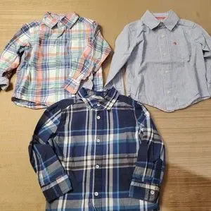 Three 100% cotton 3T button down shirts. The 2 Carter's shirts are in like new condition. The blue H&M shirt has a small stain as pictured.