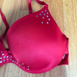 Experience the allure of La SENZA's red and silver bra, featuring sparkling embellishments that add a touch of glamour. This molded cup bra offers smooth padding and adjustable straps for a comfortable fit, making it a standout piece in your intimate collection. Like new, worn once.