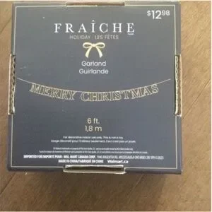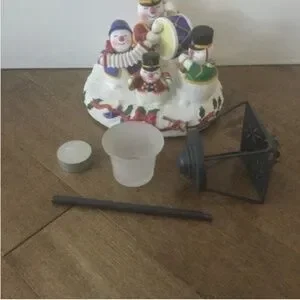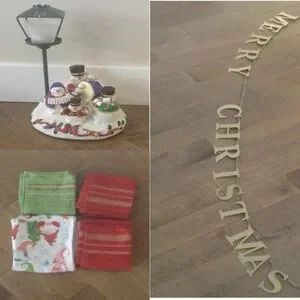 Includes: Light up Christmas decoration with real unscented candle, 6ft holiday garland (metal letters), 4pc (never used) Christmas decoration dish towels (hand wash and rack dry only). All new and high quality.