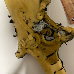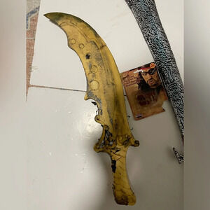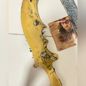 • The smaller yellow sword has noticeable wear and tear along the blade and handle.