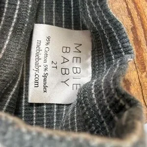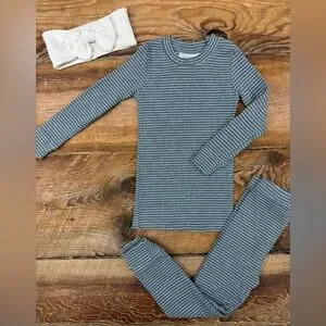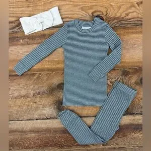 Cozy long-sleeve thermal top and matching leggings. Soft grey with thin white stripes. Includes a cream knit headband. Simple, versatile set good for layering.
