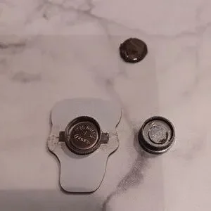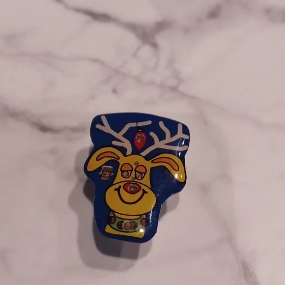 Flashing Rudolph pin with magnetic back, twist battery back to activate flashing lights, paint is peeling on magnet and battery needs to be replaced, but otherwise pin is in excellent condition.