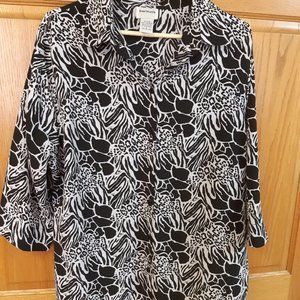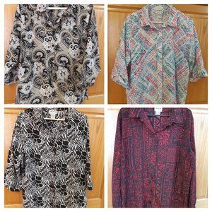 Seldom worn and very well cared for, these blouses are perfect for an office environment. All from BonWorth so sizes are generous. 3 are medium (fit like large) and the 4th is large (fits like extra large) . Great with dress pants or jeans. Purchased just prior to retiring. Selling all four as one package, save on shipping.