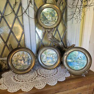 Set of four vintage solid brass wall plates made in England, depicting scenes of country villages and thatched cottages on metallic foil (metal filigree holograms). The hologram effect is impossible to capture in a photo but is really beautiful. Each of these round wall decorations has a glass front and a hook on the back.