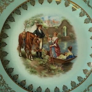 This is a JKW Bavarian Porcelain Collector Plate in Green with gold leaf trim which will make a nice addition to your collection.
