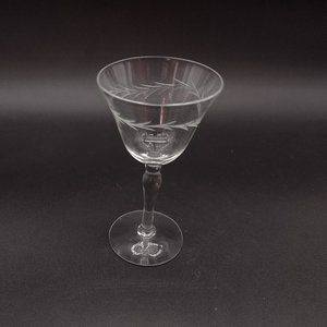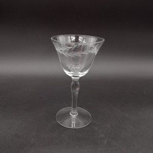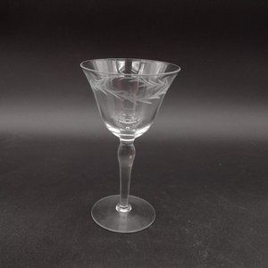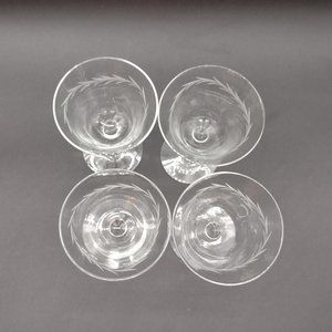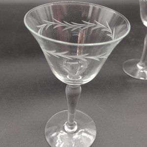 This is a set of 4 etched crystal wine glasses. The etching is of a floral and leaf theme. Their are no chips or cracks and they have only light wear.