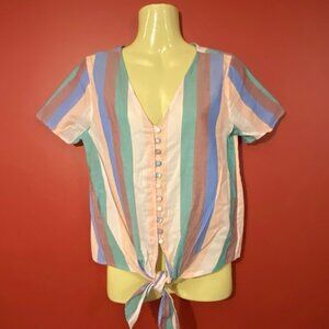Madewell Women's Striped Cropped Top - Size XXS - New with defects. This item is new with tag but there are some holes in the tied area on top. It is not noticeable when tied, but when untied (last photo showed untied). 100% cotton. Short sleeved. Button up front. Pit to pit: 17". Length on back: 20".