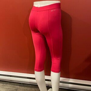NIKE Pro Combat Women's Pink Dri-fit Compression Leggings - Size Small. Good preowned condition with minor wear on "Toy Box Fitness Crossfit" printing. 82% polyester, 18% spandex. Waist: 24" unstretched. Inseam: 18.5". Front rise: 6.5".