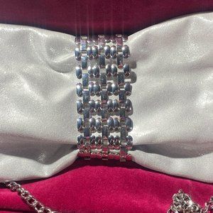 Lovely! Pearlised shimmer grey body with beautiful chrome nickel closure and chain. Magnetic clasp closure, strap can be removed and purse carried as clutch. New with tag however there is some minor micro abrasions on clasp - see pic.