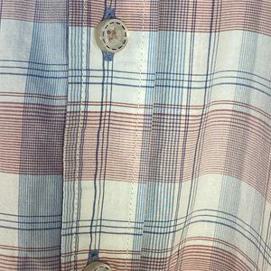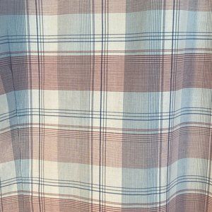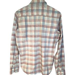 Pure made in Germany, size medium, long-sleeved button down shirt in blue, white and pink checks with contrast pattern on interior of front placket and under cuffs, and contrast color side vents.