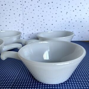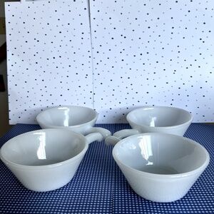 4 Fire-King French Onion Soup Bowls White Milk Glass Handled Chili Made USA