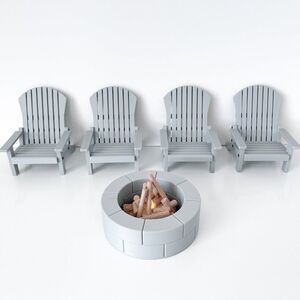 4 Gray Miniature Adirondack Chairs & Round Firepit W/Flickering Logs 1:6 Scale