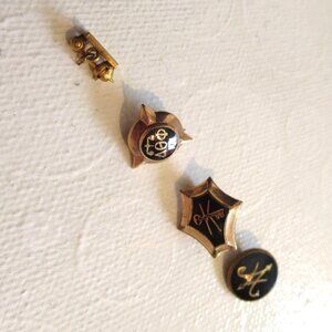 4 small collectable lapel pins. I believe 3 of the pins to be from the same fraternity and/or law school.