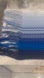 Stylish chevron pattern scarf with fringe. Features shades of blue, white and black