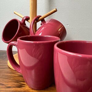 Description 🔴 Four Corelle stoneware coffee / tea mugs in a beautiful red berry / burgundy color. Microwave and dishwasher safe.