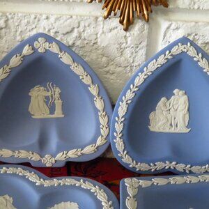 Elevate your collection with these 4 Vintage Diamond, heart, clover, and spade shaped Wedgwood Blue Jasperware Trinkets pin dishes and trays from 1952. At Josmoon Vintage Shop, we pride ourselves on curating unique retro accessories that add charm and sophistication to any space. Skillfully crafted, each trinket dish embodies timeless elegance and meticulous detail, perfect for holding your cherished jewelry or small keepsakes. Discover the magic of vintage with these exquisite pieces, a testament to enduring style and quality. Indulge in the nostalgic allure and impeccable craftsmanship that Josmoon Vintage Shop is known for.