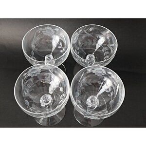 They are all in very good condition with no chips, no cracks and no scratches. They have an floral etched design and have a swirled stem.