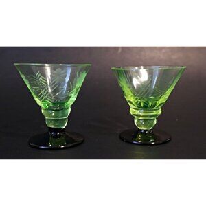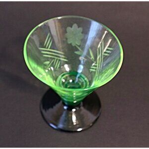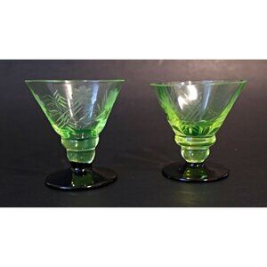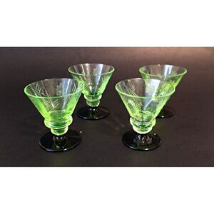 For your consideration is a vintage set of four uranium green Depression Glass etched cordials with a black base stem, circa 1930s.
