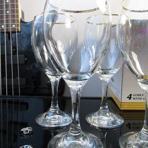 Description. Elevate your dining experience with this stunning set of 4 Pasabahce water goblets. Each goblet is made of clear glass and features a luxurious gold rim, adding a touch of elegance to any occasion. Perfect for all occasions, these goblets are versatile and can be used for water, wine, or any other beverage of your choice. Crafted from high-quality glass, these wine glasses are durable and long-lasting. The set comes in its original box. Whether you're hosting a dinner party or enjoying a quiet evening at home, these wine glasses are sure to impress.