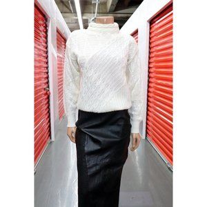 We are so smitten with this charming vintage sweater. Four design patterns encapsulated in one sweater. Sweater features a high collar and is crafted in a very soft knit fiber.