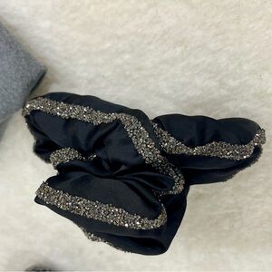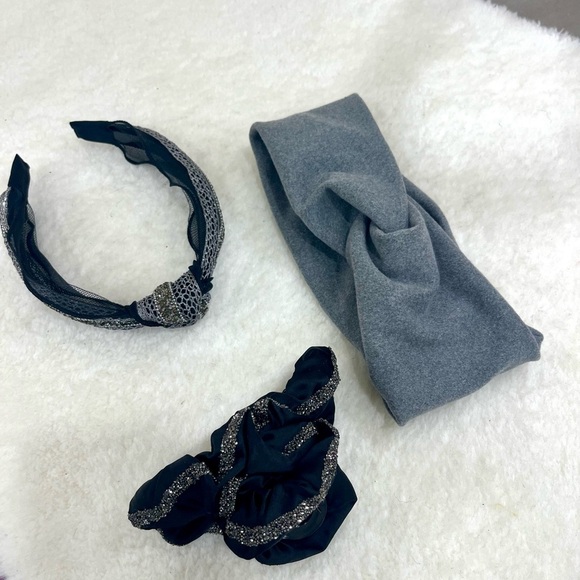 Set of three stylish hair accessories. Includes a gray twisted headband, a black headband with lace detail, and a black scrunchie with silver accents.