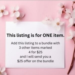 Buy alone, or Bundle this item with 3 other items marked 💥4 for $25💥 for some major savings! Simply add 4 items marked 💥4 for $25💥 to a bundle and send a $25 offer, and I will accept!
