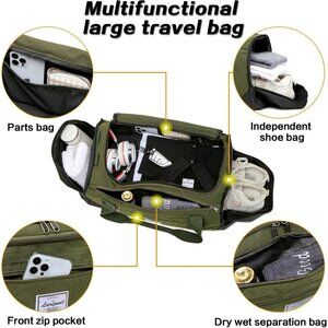 【Multiple Pockets】Duffle bag for men has 1 main bag, 1 front zip pocket, 1 wet pocket, 1 independent shoe compartment, 1 side zip pocket, 1 inner zip pocket, 2 hand webbing straps, 1 back luggage sleeve.