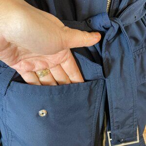 Women’s Tommy Hilfiger Navy Blue Jacket, Size XL — a lightweight, lined, and stylish piece featuring a belted waist for a flattering fit. Designed with four functional pockets (two on the chest and two on the sides), this versatile jacket is perfect for layering in any season.