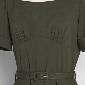 Vintage flare dress, featuring vintage dark green colour, square neck, Bodice top, short fold sleeves, pockets, with a belt, midi length, zip detail.